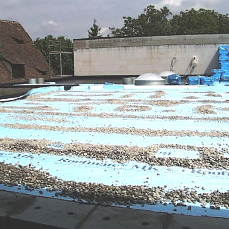 Umkehrdach: Betondecke, bituminöse Abdichtung, Wärmedämmung aus XPS-Platten, Vlies, Donaukies 16/32